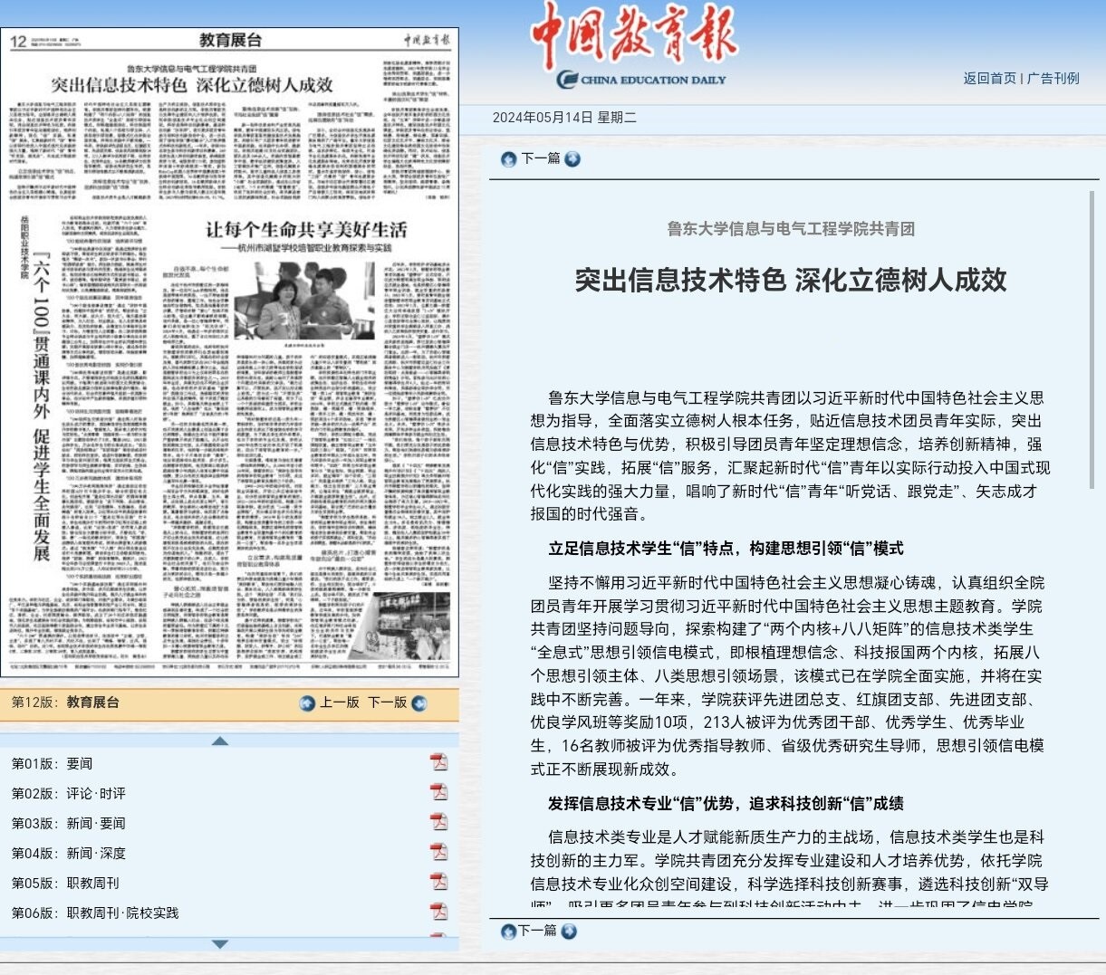 5月14日,《中国教育报》以“突出信息技术特色,深化立德树人成效”为题报道英国365上市公司信息与电气工程学院共青团工作。信息与电气工程学院共青团在学校团委和学院党委领导下,坚持以习近平新时代中国特色社会主义思想为指导,全面落实立德树人根本任务,始终贴近信息技术团员青年实际,突出信息技术特色与优势,通过立足信息技术学生“信”特点,构建思想引领“信”模式,发挥信息技术专业“信”优势,追求科技创新“信”成绩,聚焦信息技术发展“信”形势,书写社会实践“信”篇章,围绕信息技术社会“信”需求,拓展志愿服务“信”阵地,突出信息技术学生“信”特色,丰富校园文化“信”课堂,积极引导团员青年坚定理想信念,践行“严谨、精益、卓越”的鲁大质量文化,努力培养创新精神,强化信息技术社会实践,拓展信息技术志愿服务,以实际行动投入中国式现代化伟大实践,以优异成绩彰显新时代鲁大青年学子“听党话、跟党走”、矢志成才报国的青春风采。(信息与电气工程学院 通讯员:吴璇)