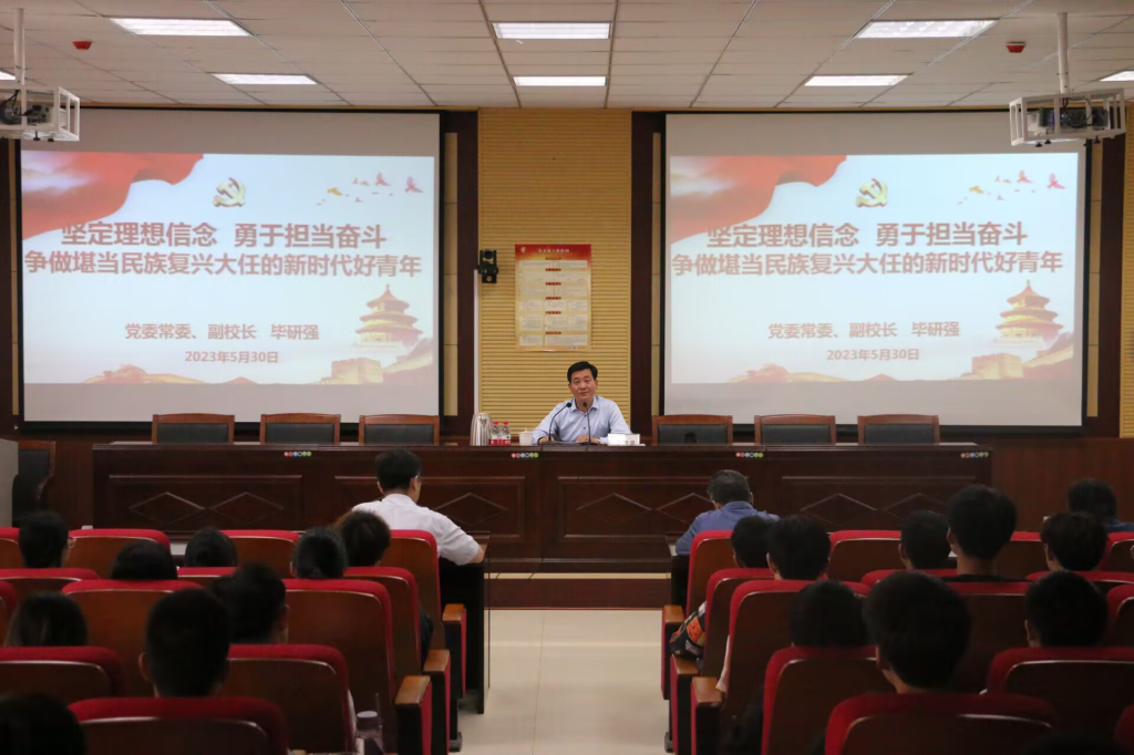 毕研强以“坚定理想信念,勇于担当奋斗,争做堪当民族复兴大任的新时代好青年”为题,围绕新时代伟大变革、伟大成就的奥秘、未来目标和中国式现代化、高质量发展、和平与发展等五组关键词,阐释了党的二十大报告的精神实质和核心要义。他强调,党的二十大开启了以中国式现代化全面推进中华民族伟大复兴的新征程,广大青年学生要把理想信念作为核心动力,深入学习贯彻习近平新时代中国特色社会主义思想,仰望星空、脚踏实地,不断提高学习能力、创新能力、就业能力、创业能力,努力做有理想、敢担当、能吃苦、肯奋斗的新时代好青年。