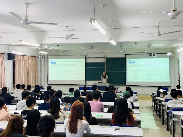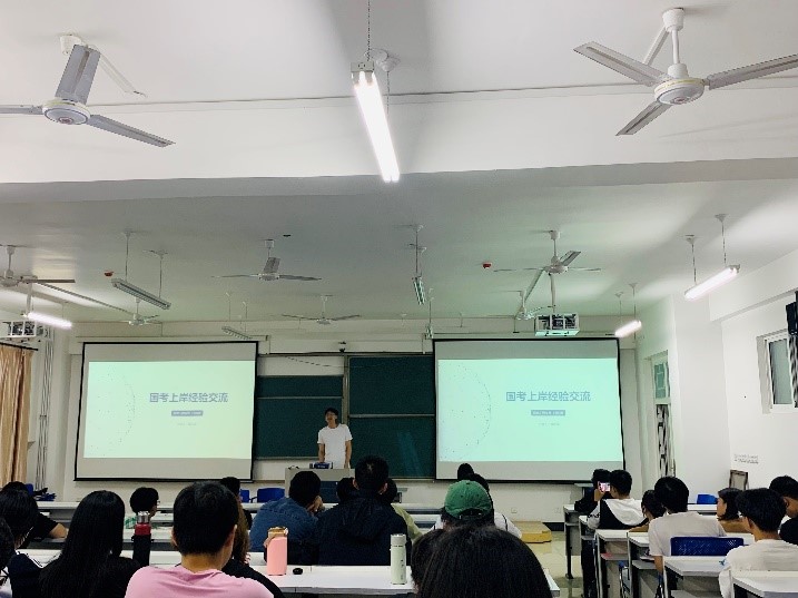 毕业生代表潘世龙、赵琪、郑雅心和邹倩慧分别从各自岗位报考条件、时间安排、笔试面试准备、备考工具书以及应试技巧等各方面做了详细的介绍,并结合不同考试的侧重点和自身经历给出了实用的备考建议。潘世龙建议大家尽快明确自己的就业目标,提前做好就业规划,提高学习的针对性。在交流环节,大家针对信息搜集、岗位选择、面试环节等方面进行了交流,现场气氛积极热烈。