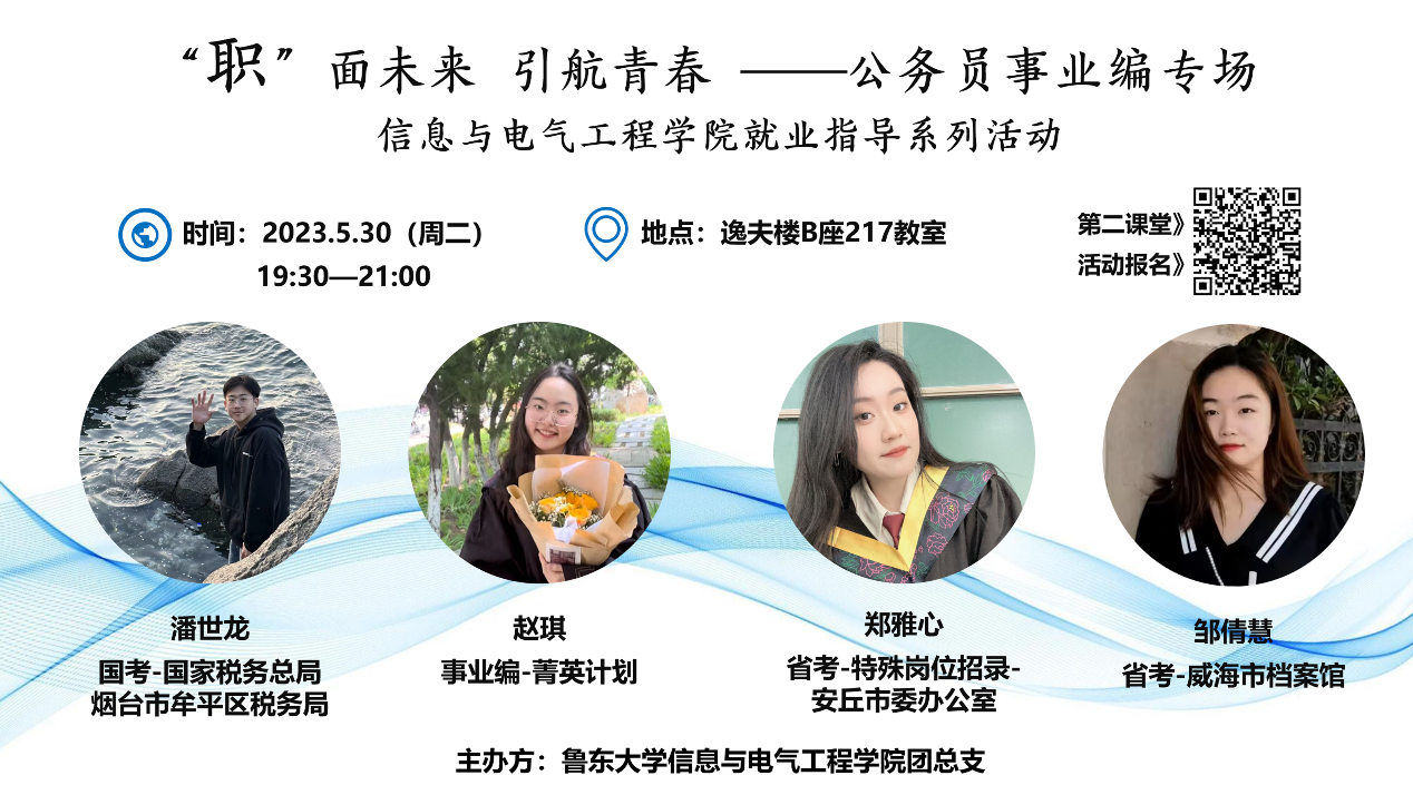 5月30日晚,信息与电气工程学院举办“‘职’面未来 引航青春”2023年就业经验交流会—公务员事业编专场,邀请2023届考取公务员、事业编的4位优秀毕业生代表主讲,为在校生介绍相关岗位信息、分享备考经验。
