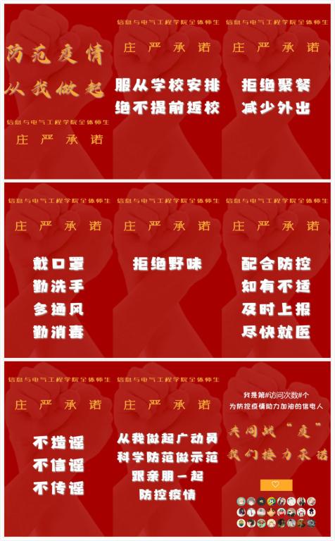 “防范疫情,从我做起”展示了疫情防护方法和一些提醒事项:拒绝聚餐、必戴口罩、勤快洗手、拒吃野味、科学就医、拒绝谣言、配合防控、不可提前返校等,以承诺的方式在微信中接力转发。活动简单易行,内容通俗易懂,既将科普知识了然于心,又自觉承担起转发宣传义务,培养“防控疫情,每个人都是主人翁”的意识。
