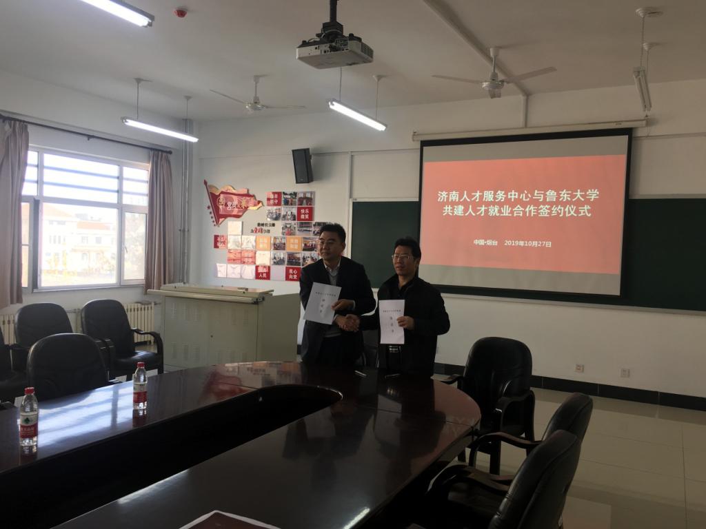 在签约仪式上,学校招生就业处副处长吴远庆首先介绍了学生的培养情况与就业工作开展情况,济南市人才服务中心主任魏巍介绍了济南市目前的引才政策。二者就目前学生就业情况、学校科研成果转化情况等进行了交流沟通。最后,吴远庆副处长和魏巍主任分别代表我校招生就业处与济南市人才服务中心签订了人才合作框架协议书,并为今后工作奠定良好基础。