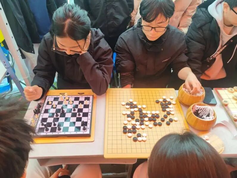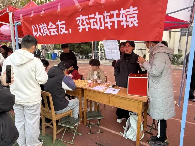 百团大战活动期间,现场陈列各类棋具、对局图谱与趣味海报,设自由对弈及新手体验区,骨干全程提供基础指导。同学们踊跃参与对弈与桌游互动,既直观感受棋牌魅力,又结识同好,现场氛围热烈,有效扩大社团影响力,吸引众多同学报名。