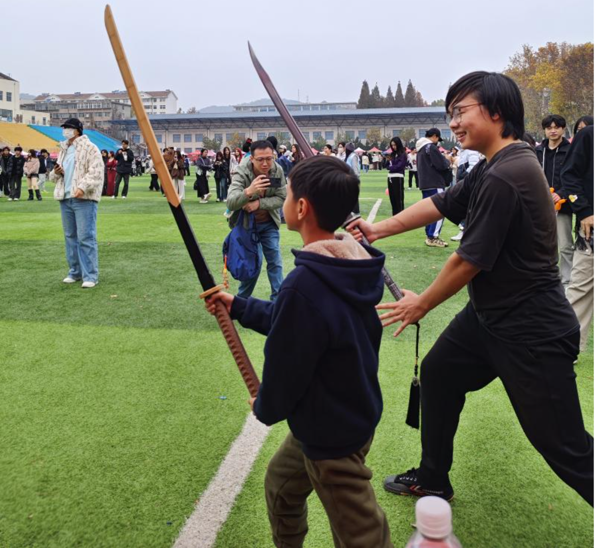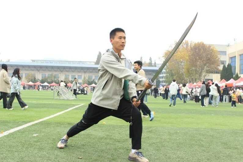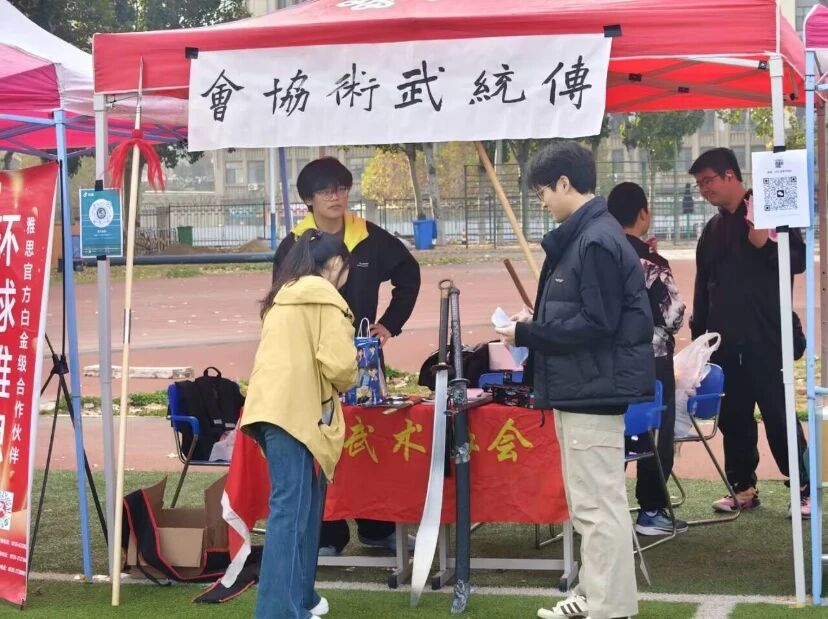 百团大战当天,协会搭起“传统武术协会”展棚,现场陈列苗刀等兵器。社员演示八极拳“小架”的刚猛招式、苗刀一路的劈砍动作,还邀请同学体验兵器握持。围观同学纷纷驻足拍照、咨询,既直观感受武术魅力,也让协会收获数十份报名意向,氛围热烈。