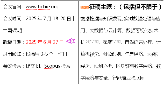 BDAIE 2025面向大数据应用、人工智能与数字经济相关主题征稿,经专家评审录用后,将以论文集的形式出版,并提交至EI、Scopus数据库。让我们相聚昆明,共同开启新篇章!