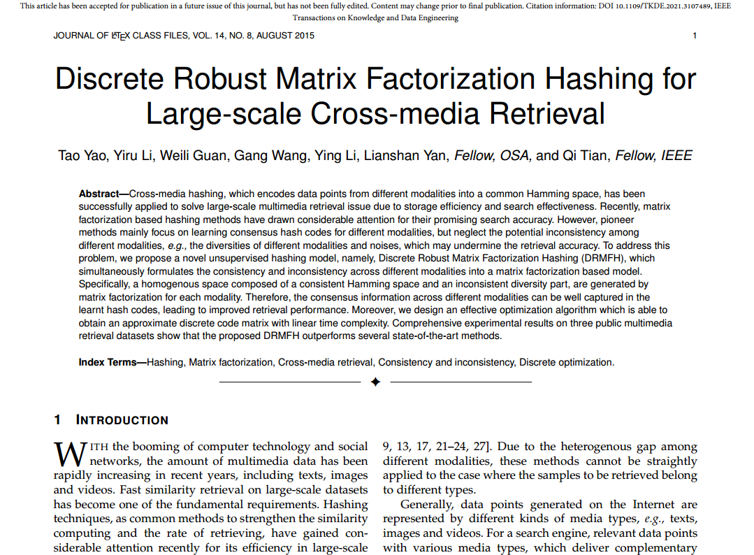 近日,信息与电气工程学院姚涛副教授团队在《IEEE Transactions on Knowledge and Data Engineering》 (CCF A类期刊)发表了题为“Discrete Robust Matrix Factorization Hashing for Large-scale Cross-media Retrieval”的学术文章,第一署名单位和通讯单位均为我校。