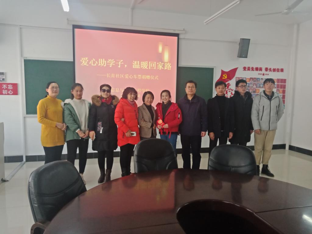1月10日上午,白石街道长青社区党委书记刘晓明携两位社区居民代表来我院举行爱心车票捐赠仪式,捐赠仪式由信息与电气工程学院党总支书记郭帅主持。