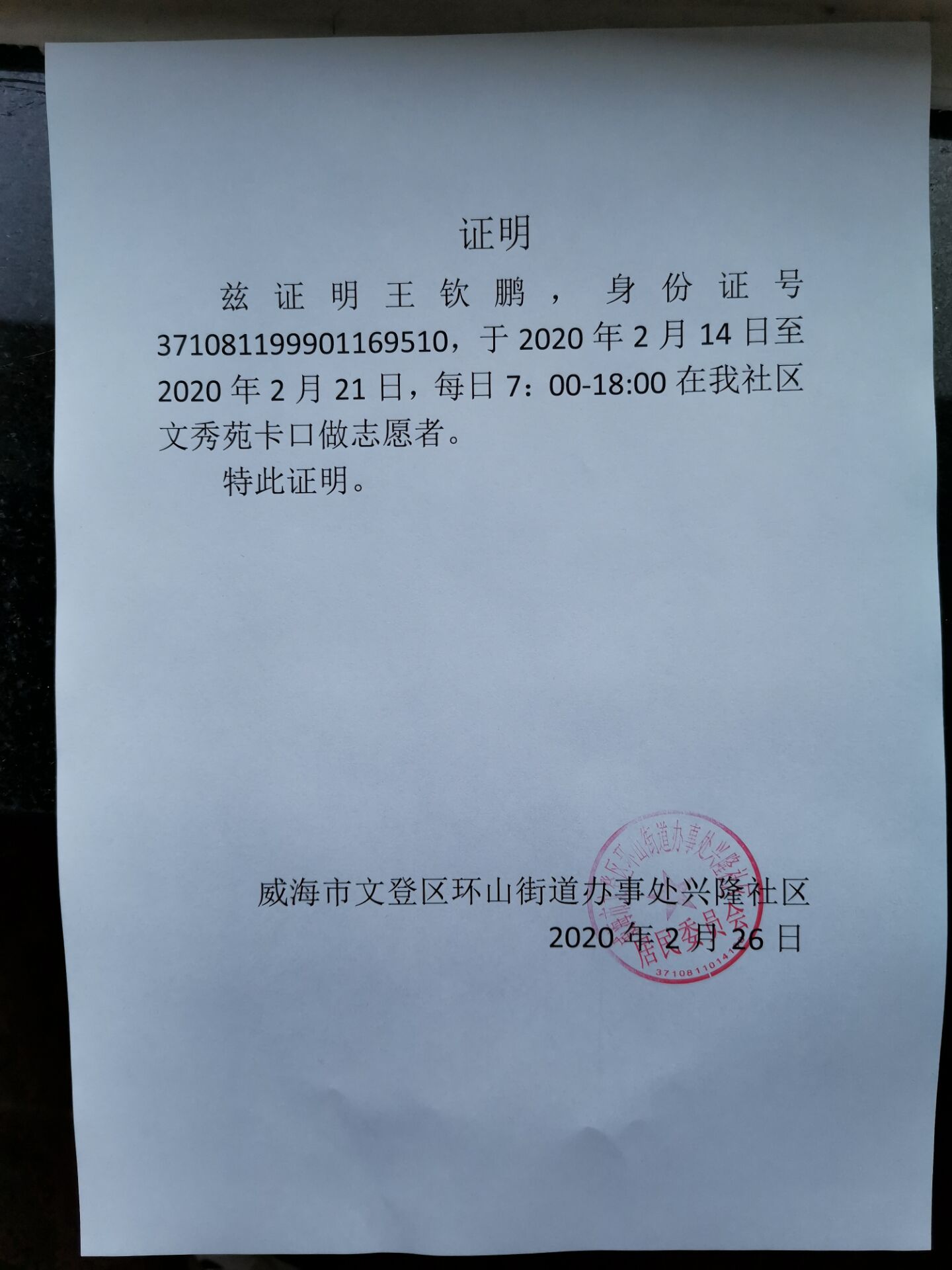 2020年2月14日至2月21日期间,我自愿作为新型冠状病毒疫情防控志愿者,在威海市文登区阳光小区卡口参与疫情防控工作,其中包括普及新型冠状病毒防控知识,对过往车辆及人员进行扫码登记,记录人员流动情况。