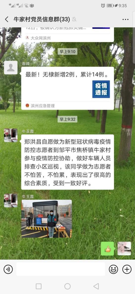 2020年2月7日至2月14日期间,我自愿作为新型冠状病毒疫情防控志愿者,到滨州市焦桥镇疫情检查站参与疫情防控工作,我主要参与了车辆人员进出排查、小区巡视等工作,防控期间村里的防控工作人员共同努力,人员进出需要量体温,做登记,车辆进出需要查记录,核实信息严格把控,小区的日常巡视更是每天必要的工作。